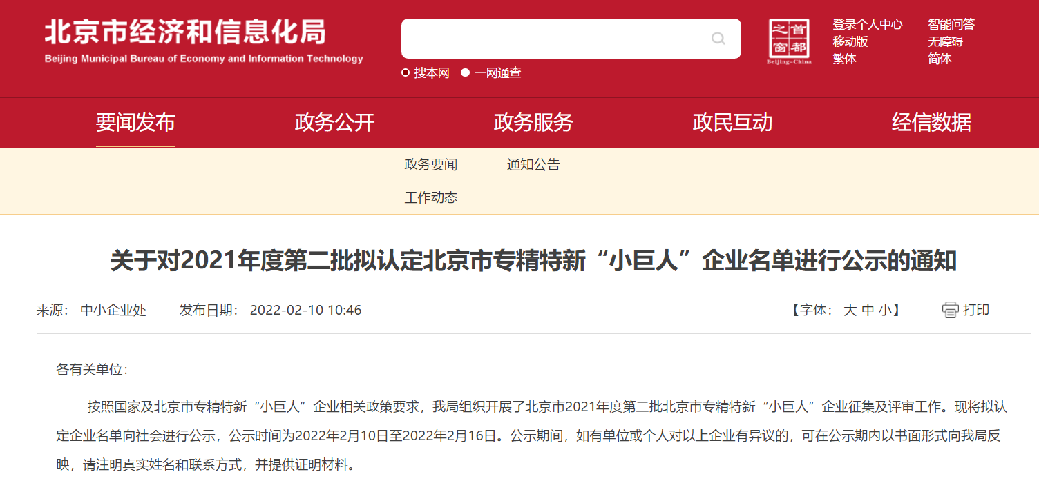 喜訊|北京世紀金光入選北京市專精特新“小巨人”擬定企業名單